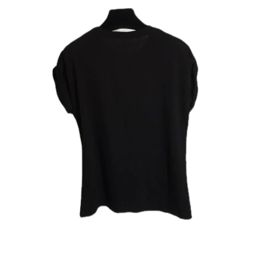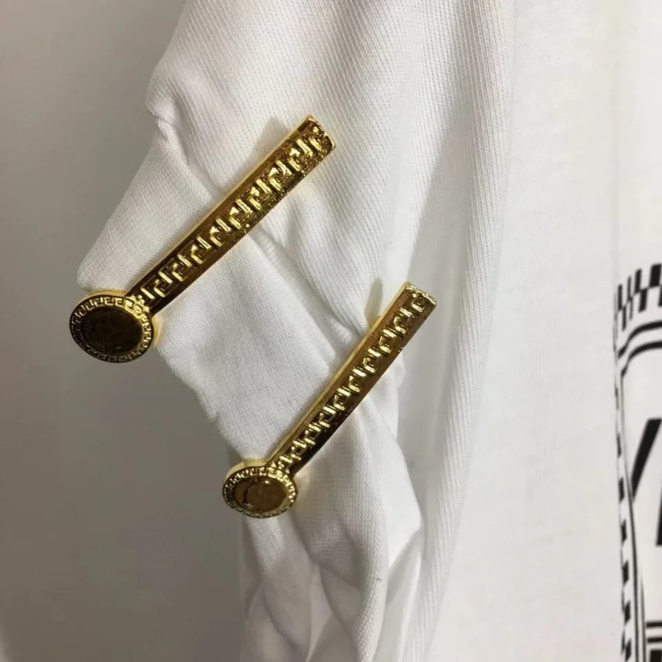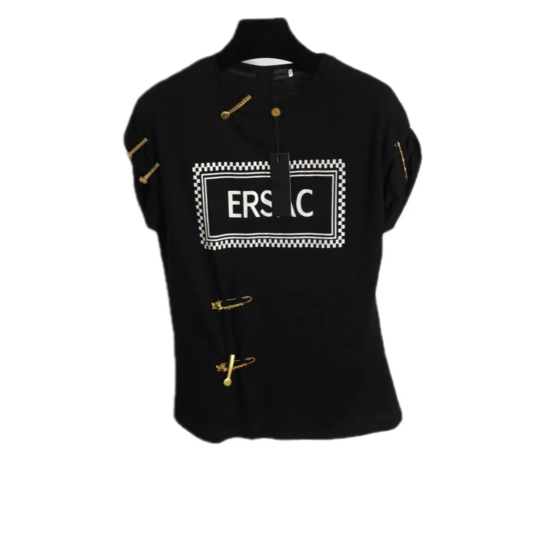 Featuring a trendy letter print and stylish metal pin, this T-shirt adds a contemporary touch to any outfit.